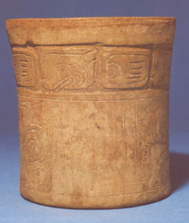 Vaso de pared ligeramente divergente, base plana, borde redondeado. Decoración: abajo del borde una banda de glifos en bajo relieve. La pared presenta diseños incisos de rostros de monos con orejeras y volutas saliendo de la boca. Pieza donada por el señor Angel Cordón el 25 de abril de 1984.