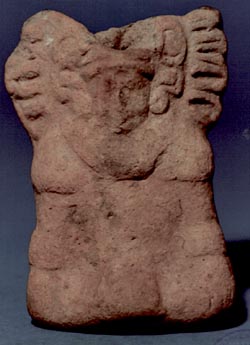 Figurilla silbato antropomorfo, representación femenina, con orejeras, tocado en forma de diadema, y los brazos cruzados. Donación: Alfredo Monsanto.