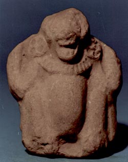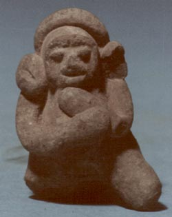 Figurilla silbato, personaje sentado con las piernas entrecruzadas y las manos apoyadas sobre las rodillas. El personaje lleva taparrabo, muñequeras y collar, tocado de plumas. Pieza donada por el señor Alfredo Monsanto.