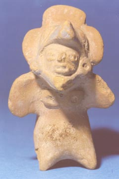Figurilla silbato, representa un personaje parado con un taparrabo con cinturón amarrado al frente, los brazos cruzados sobre el pecho. Tiene una máscara zoomorfa. Pieza donada por el señor Alfredo Monsanto.