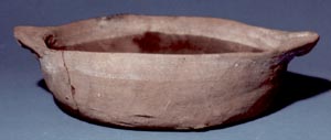 Cuenco de pared recta, base plana, borde redondeado. Decoración: una banda blanca sobre el borde en el interior y exterior, dos asas horizontales.