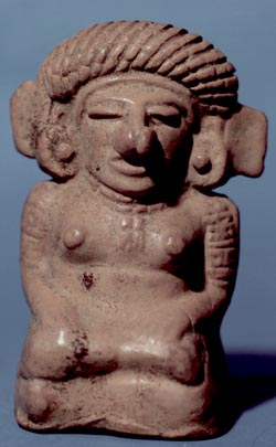 Figurilla femenina con tocado trenzado sobre la cabeza, orejeras, nariguera en forma de cuentas redondas, brazaletes, pechos descubiertos.