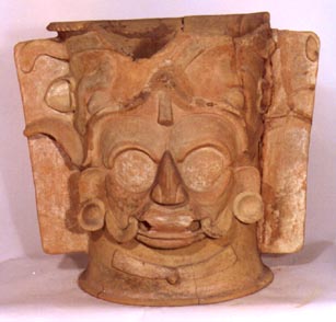 Urna funeraria de pared recta, borde evertido con acanaladuras, base pedestal. Decoración: efigie antropomorfa, orejeras, de la boca parecen salir unas volutas. El personaje parece salir de las fauces de un monstruo, Sus ojos son blancos. El monstruo tiene las cejas pintadas de azul. La urna tiene asas largas verticales pintadas de blanco.