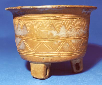 Cuenco de pared recta, borde redondeado evertido, base trípode. Decoración: líneas incisas alrededor de la pieza, abajo de ellas diseños de triángulos incisos, soportes cuadrados con sonaja. Vajilla plomiza.