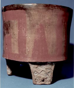 Cuenco de pared ligeramente divergente, borde redondeado, base trípode. Decoración: diseños geométricos en líneas gruesas pintadas en rojo. Los soportes son cuadrados y tienen diseños moldeados de efigies zoomorfas.