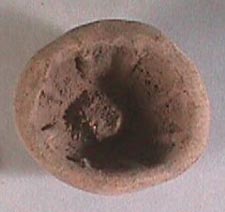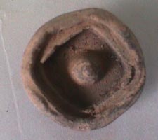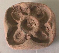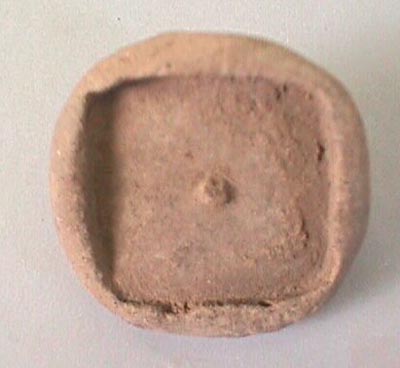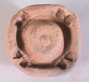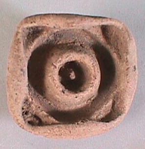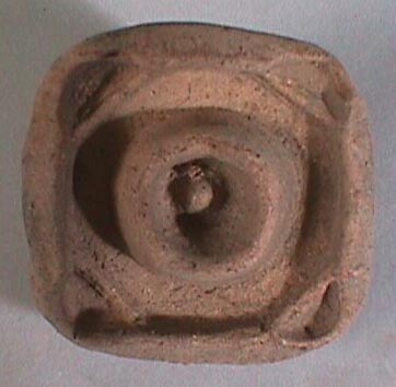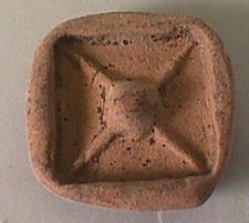 Molde cuadrangular, el diseño consiste en cuatro líneas inclinadas en cada esquina, al centro posee una acanaladura circular.