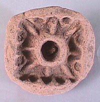 Molde de sello cuadrado, el diseño consiste en cuatro líneas inclinadas en cada esquina que a su vez estan divididas por el medio, en el centro presenta una aplicación.