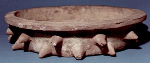 Cuenco de pared recta, base plana, borde evertido plano. Decoración: protuberancias en forma de púas alrededor del cuerpo.