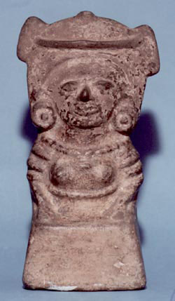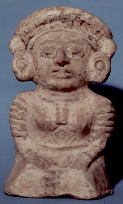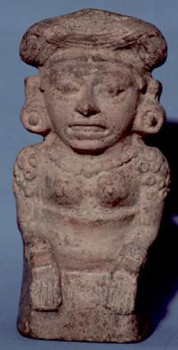 Figurilla femenina, sentada con las manos sobre las rodillas, busto desnudo. Decoración: falda larga, collar de cuentas, orejeras, en los brazos muñequeras tubulares, el cabello areglado sobre la cabeza. Presenta un agujero atrás de la cabeza.
