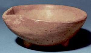 Cuenco de pared curvo convergente, base trípode, borde redondeado con vertedera, soportes cónicos. Decoración: Una banda de color naranja sobre el borde.