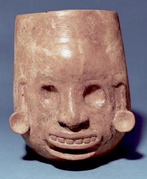 Vaso de pared curvo convergente, base cóncava, borde redondeado. Decoración: efigie antropomorfa en alto relieve, con orejeras, ojos redondondos hundidos, nariz, boca con piezas dentales expuestas. Abajo de la boca parece salir una pestaña. Pertenece a la vajilla Tiquisate.