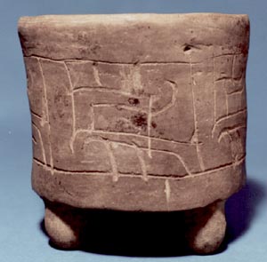 Vaso de pared recta, borde redondeado, base trípode. Decoración: inciso medio con diseños geométricos.