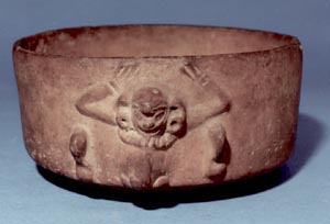 Cuenco de pared recta, borde redondeado, base cóncava. Decoración: un mono en relieve con las manos hacia arriba, con orejeras y collar. El mono muestra sus genitales, y en la parte de atrás del cuenco se puede observar la cola, en relieve.