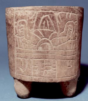 Vaso de pared recta, borde redondeado, base trípode, soportes semi-esféricos. Decoración: 2 páneles incisos geométricos abstractos.
