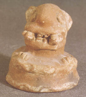 Urna miniatura, de pared vertical, base trípode, borde plano y soportes cónicos. Decoración: pestaña basal y labial, tapadera zoomorfa jaguar, la efigie presenta colmillos expuestos, orejas redondas, y las patas del jaguar sobresalen de la tapadera.