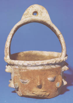 Incensario de pared recta, base plana, borde plano. Decoración: rostro antropomorfo, orejeras azules, ojos blancos, 4 protuberancias pintadas en blanco a los lados del rostro. Sobre el incensario un agarrador pintado en blanco sobre el cual hay una asa con un agujero en el centro.