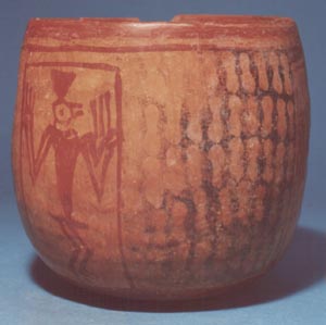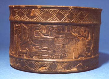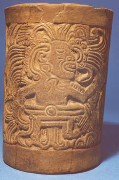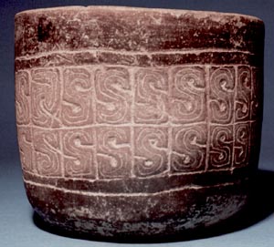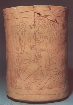 Vaso de pared recta, borde redondeado, base plana. Decoración: inciso medio, personaje sentado con los brazos y piernas cruzadas, tocado alto. Frente al personaje hay un bastón con una efigie humana.