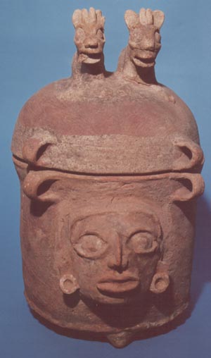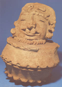 Urna funeraria trípode con tapadera y pared vertical. La superficie de la urna presenta una textura burda y restos de pintura roja y negra. Decoración: un rostro humano en relieve con rasgos moldeados, de 12 cm. de largo y de 14 cm. de ancho. El rostro tiene los ojos abiertos rasgados, nariz curvada, labios protuberantes…