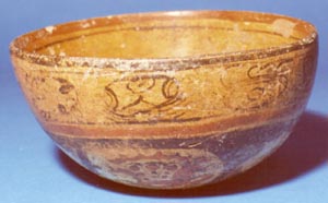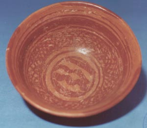 Cuenco de vajilla Copador de pared ligeramente divergente, base cóncava, y borde redondeado. Decoración: en borde interior manchas rojas seguidas por bandas de líneas rojas, en el fondo un diseño ashurado en rojo, seguida por un círculo dentro del cual se encuentran bandas curvas en rojo. Todo el diseño se encuentra sobre un fondo naranja.…