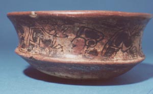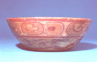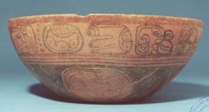 Cuenco de vajilla Copador, pared curva, base cóncava, borde redondeado. Decoración: en la pared interior sobre el borde una banda de color rojo seguida por una banda de color negro, abajo de ella una banda de diseño de pseudoglifos, en el fondo 3 círculos, dos negros y un rojo. En la pared exterior abajo del…