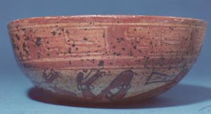 Cuenco de vajilla Copador de pared curva, base plana, borde redondeado. Decoración: en la pared interior el borde se encuentra pintado de rojo; abajo de él hay dos líneas de color negro. El diseño principal consiste en 3 aves de pico largo posadas en una línea de color negro que se encuentra en el fondo…
