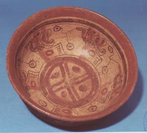Cuenco de vajilla Copador de silueta compuesta, base cóncava, borde ligeramente evertido. Decoración: en el interior 5 diseños zoomorfos abstractos los cuales están distribuidos alrededor de un diseño geométrico en el fondo. Este diseño consiste en un círculo rojo con una cruz en el centro. En cada cuadro que forma la cruz se encuentran 4…