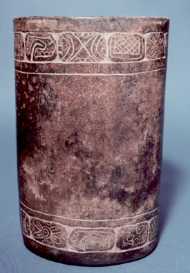 Vaso de pared recta, base plana, borde redondeado. Decoración: una banda de glifos en bajo relieve seguida por una línea incisa, cerca de la base otro diseño de glifos en bajo relieve.