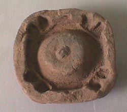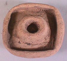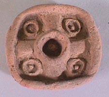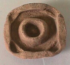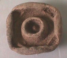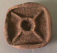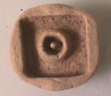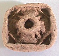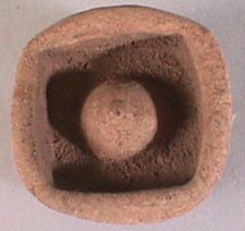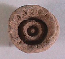 Molde circular de sello, al centro se observa una acanaladura en forma circular, rodeada por una acanaladura, en la pared interna posee pequeñas molduras, verticales, paralelas. Estado de Conservación: erosionado
