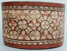 Cuenco de vajilla Chamá, con pared vertical, base plana, borde redondeado. Decoración: una banda de color rojo abajo del borde, seguida por una banda de puntas de flecha en crema y negro. El diseño principal, círculos, cuadros y triángulos delineados en negro, adentro de ellos líneas concéntricas en negro y rojo, cerca de la base…