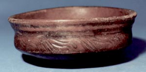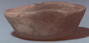 Cuenco de pared divergente aplanada a los lados y base ì ligeramente cóncava. Decoración: una banda roja sobre el borde.