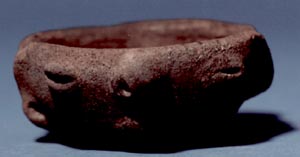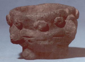 Cuenco trípode de pared curva, borde redondeadoy soportes cilíndircos. Decoración: diseños de pastillaje e inciso en forma de puntos cerca de la base.