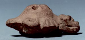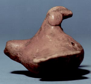 Figurilla silbato zoomorfa, posiblemente un ave. El orificio de entrada del aire se encuentra en la cola, y los orificios donde sale el aire sobre la espalda del ave. No presenta decoración.
