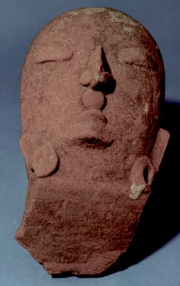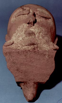 Fragmento de incensario de tres cabezas, compuesto por un cuenco de pared divergente, soporte cilíndrico, cabeza antropomorfa de complexión gruesa. Decoración: pintura blanca en la boca y los ojos, orejeras y ojos realizados con la técnica de pastillaje.