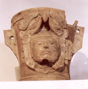 Urna funeraria de pared curvo divergente, moldura labial y basal, base pedestal, borde ligeramente evertido, dos asas alargadas a los lados con orificios en la parte superior posiblemente para colocar orejeras. Decoración: un rostro humano emergiendo de las fauces de un ave, con la parte del maxilar inferior aplicado con la técnica de pastillaje y…