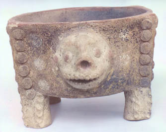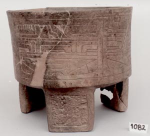 Cuenco de pared recta, base trípode, borde redondeado, soportes cuadrados. Decoración: inciso medio geométrico. Los soportes presentan decoración de un personaje sentado con tocado alto, y varios diseños de puntos a los lados.