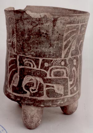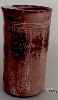 Vaso de pared recta, base cóncava, y borde ligeramente evertido. Decoración: inciso medio en la pared exterior. Abajo del borde hay cuatro incisiones horizontales y tres verticales, las cuales se intercalan con líneas trenzadas.