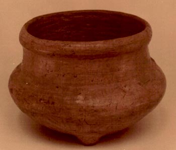 Cuenco de silueta compuesta, base trípode, borde engrosado, soportes cónicos. Decoración: tipo Usulután de líneas cruzadas.