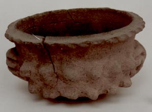 Cuenco de pared ligeramente divergente, borde plano. Decoración: en la orilla del borde presenta impresiones de dedo, en el cuerpo se observan dos filas de protuberancias puntiagudas y a cada lado del cuenco y en la parte de atrás se observan tres protuberancias, dos en forma de dedos y una alargada que va del borde…