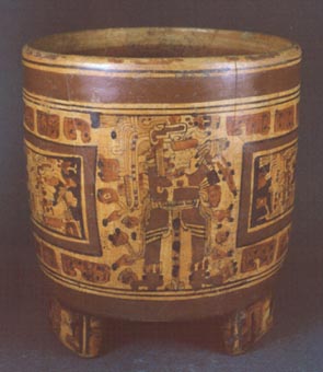 Vaso trípode Ulúa-Yojoa, de pared ligeramente curva, base trípode, borde directo agudo, soportes cuadrados con ventiladores. La pieza presenta la decoración de tres páneles, el primero es un personaje sentado con rico tocado y las manos atadas; los otros presentan la misma posición de prisioneros, por el rico tocado pueden ser gobernantes prisioneros. Los personajes…