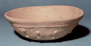 Cuenco de pared ligeramente divergente, borde directo agudo, base plana. La decoración presenta cuatro pretuberancias, dos de cada lado.