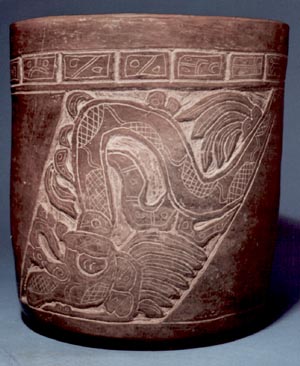 Vaso café negro, decorado en bajo relieve, con pared recta, base poco cóncava, borde directo redondeado. La decoración de la pieza presenta una banda de glifos que incluyen el “AHAU” en posición natural, boca arriba. Estos alternan con símbolos de muerte. En los dos lados opuestos de la vasija hay una serpiente mitológica, la cabeza…