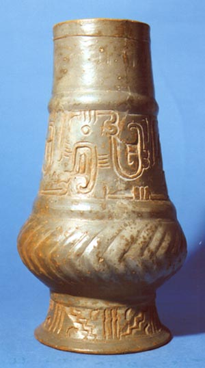 Vaso plomizo, pared silueta compuesta, base pedestal, borde directo redondeado. Su decoración en la pared exterior es inciso medio, la cual se encuentra enmarcada por dos molduras. Este diseño presenta una serie de rostros de monstruo Cauac de perfil. La parte inferior de la pared tiene forma subglobular y se encuentra decorada por acanaladuras. En…