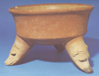 Cuenco con tres soportes, soportes zoomorfos con sonaja, pared curvo divergente, borde engrosado. Los soportes posiblemente son pizotes, con las orejas en forma de grano de café. 27/1/05 El Dr. Dennis Guerra Centeno identifica los animales como grisones o pericos ligeros.