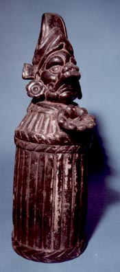 Vaso de pared vertical con acanaladuras verticales, base plana, tapadera antropomorfa. El vaso consta de dos partes, en forma de un ser humano con una máscara de ave, la cabeza y el pecho lo forman la tapadera. La máscara tiene pico largo, orejeras, tocado alto. Sobre el pecho lleva una especie de flor, cerca del…