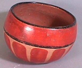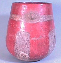 Vaso bicromo (rojo y crema), labio redondeado, cuerpo curvo convergente, base cóncava. Decoración: debajo del borde una banda crema con una efigie de un posible zoomorfo. Debajo cinco bandas cremas que llegan hasta la base. El fondo es de color rojo.