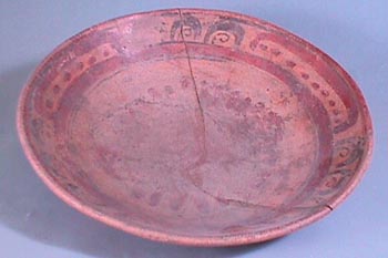 Plato policromo (naranja, rojo, negro), labio redondeado, pared curvo convergente, base plana. Decoración: labio pintado de rojo, seguido por una banda enmarcada por dos líneas negras, en la banda se observan tres grupos con tres diseños espirales color negro, intercalado se observa una línea roja, con puntos rojos adentro de dicha banda, seguido una banda…