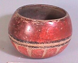 Cuenco policromo (rojo, naranja, negro), labio redondeado, pared curvo convergente, base plana. Decoración: labio pintado de negro debajo una banda roja seguido por una línea negro y bandas rojas verticales alrededor del cuerpo que llegan a la base.