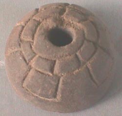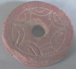 Malacate circular color rojo, agujero en el centro, base plana. Decoración. en la pared tiene una acanaladura. En la superficie tiene diseños incisos en forma de semicirculos.