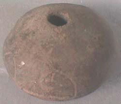 Malacate color negro, pared curvo convergente, agujero en el centro, base plana. Decoración: incisiones alrededor del cuerpo formando arcos.