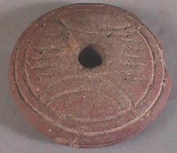 Malacate color rojo, pared curvo convergente, agujero en el centro, base plana. Decoración: dos grupos paralelos de cincos líneas incisas, en medio de ellos dos líneas incisas en forma de arcos, debajo dos línes incisas paralelas.